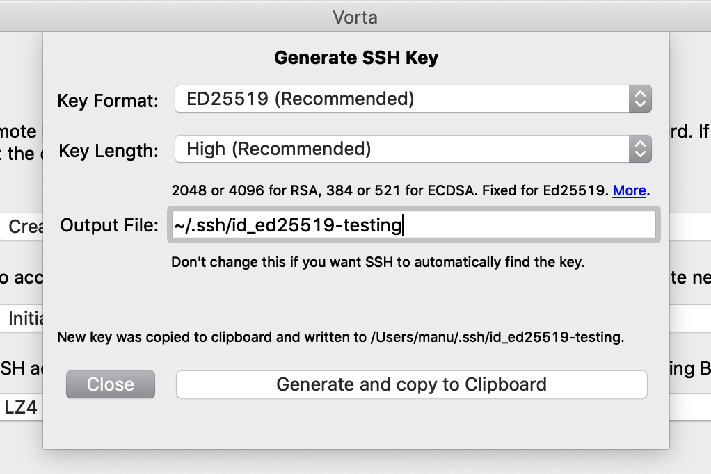 Vorta makes it simple to create a new public-private keypair. Simply choose Create New Key from the settings window. This will open a new window to configure some options. Generally the defaults are the best options and there is no reason to change them.