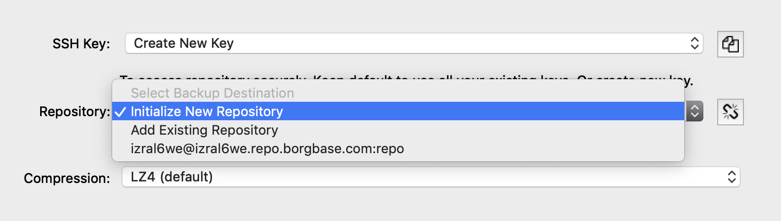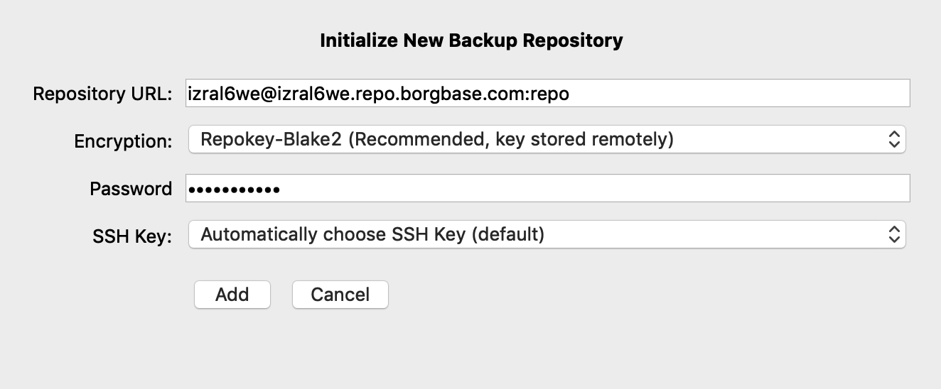 In the dialog, paste the Repo URL and choose a secure password. If you don’t have specific encryption requirements and didn’t change the default name of the SSH key, you can keep the other settings at their defaults.
